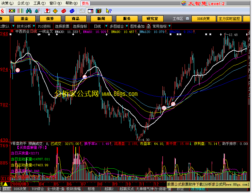 在使用该法时一定要记住是30均线一定是在朝上走时.一但30线拐头向下则要抛