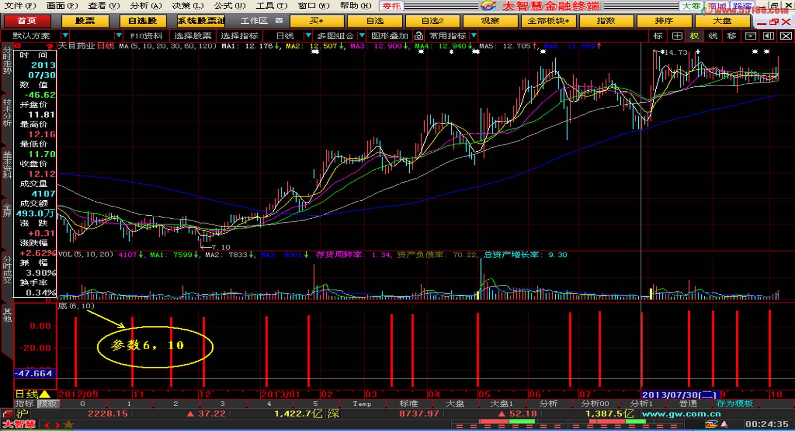 参数(6,-60)主要是寻找大底,信号比较少,可操作性高;负值越大(取值-50、60、-70),空方释放越彻底。成功率越高。如果(34,-30)【同样负值越大(取值-10、20、-30),空方释放越彻底。成功率越高】在(6,-60)发出信号附近也发出信号,那全仓买进。