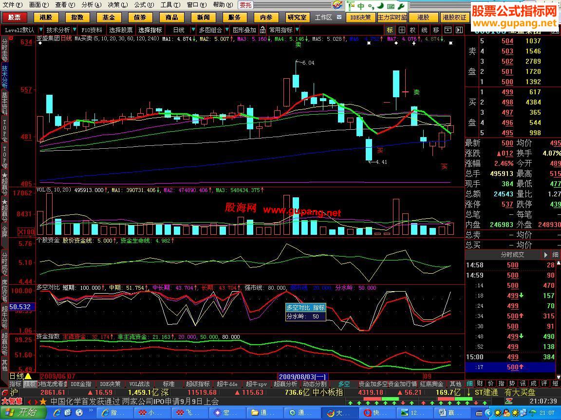 - 该指标是软件的精华所在,可以清楚的看出一只股票中主力及散户的强弱关系。它由两条趋势线及三条水平线组成,紫色趋势线代表市场主流金,绿色趋势线代表非主流资金。指标有三条水平线,从上自下数值分别为80、50、20。80以上为超强区,20以下为超弱区,50为强弱分水岭(80—50为强势区,50—20为弱势区)。
