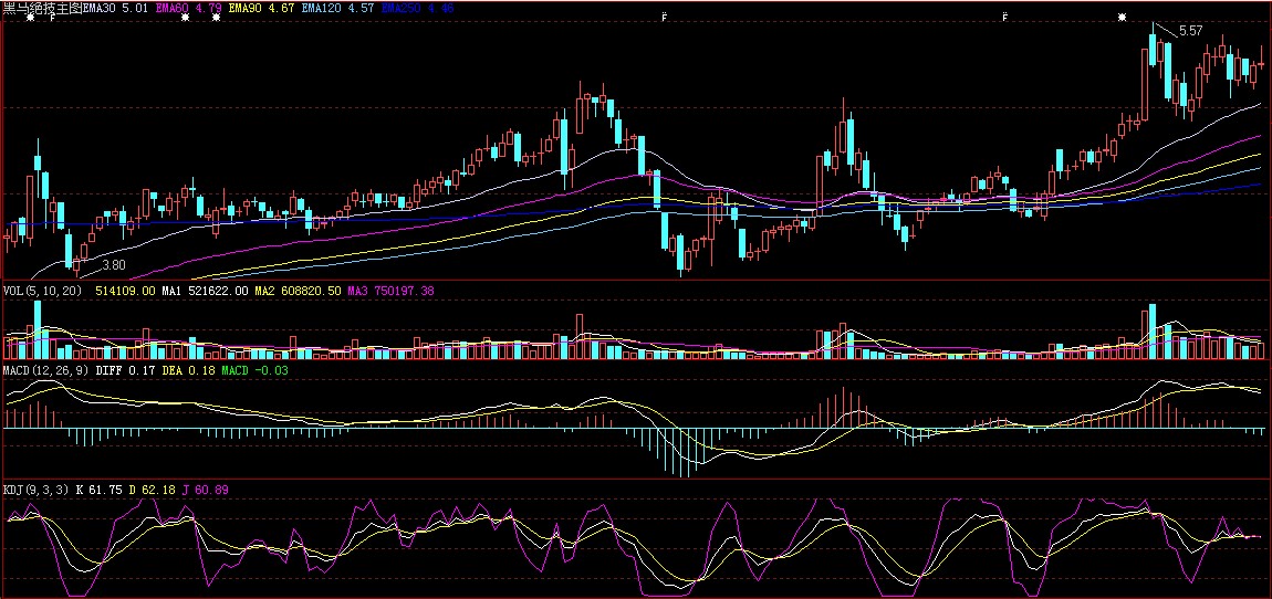 指标注释: 四线粘合、一线金叉=黑马绝技指标的原理是:一种是30.60.90.120粘合;一是指60.90.120.250粘合;一线金叉是指30均线金叉上面的两种粘合。均线粘合一般表示有主力在吸筹,而一线金叉则表示该股要拉升。该指标有两大看点:一是股价在半年线之上均线粘合;二是股价在年线之上均线粘合。参照这个指标操盘就会引导投资者去关注股价穿越半年或年线的股票,往往黑马和大牛股都在年线上产生,胜算的把握相当大。