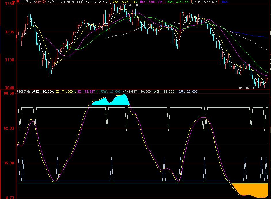 “财运亨通”指标为图形化指标。本指标反映的是多空博弈游戏中多空动能、势能交替转换的基本状态,是《庄家克星》系列精华指标之一。