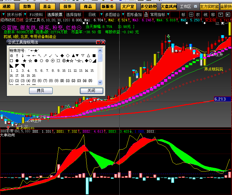 DRAWTEXTABS(12,25,'总股本:'+NUMTOSTRn(FINANCE2(35),0)+'万股' +' 流通A股:'+NUMTOSTRn(FINANCE2(37),0)+'万股'+' 市盈率:'+NUMTOSTRn(DYNAINFO(39),2)+' 倍'+' 每股收益:'+NUMTOSTRn(FINANCE2(3),3)+' 元'),Color00ff00;