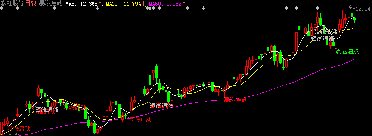 - drawtext(COUNT(XG,3)=1 AND XG and c>ma(c,20),l-0.02,'暴涨启动'),colorred;