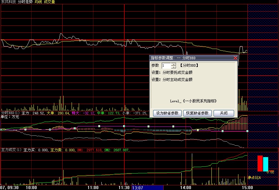 在我一生中最繁忙的那段日子里,那个该×的大智慧开发出了上证DDE,几个好事的朋友买了几个过来用,可大半年过去了效果不明显,都急了,怪这怪那的,最后得出“结论”说指标不顺手。那天真好我回国,他们直接从机场把我拉到电脑旁,不管吃不管喝硬逼着要指标,无语...用了半个多小时终于逃了出来,第二天又出门,把这茬给忘了。一个星期后,朋友都打电话来说指标好用,自己测试了一下,嘿嘿,就成了自己日常看盘用的为数不多的分时资金指标。