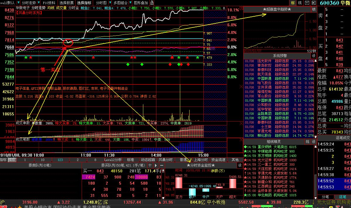 感谢大家的支持,今日放出风暴分时系列之一,内含分时主图(公式加密、无时限、无未来非常适合寻找T+0以及买卖的寻找),图中绿虚线为分时第一买点,可根据资金情况最好在突破绿虚线回档在上时,此为全天第一买点(切记)。而强势股当中会有直接突破青实体线的情况,同理回档青实体线为强势股全天的第一买点(依此类推)但有一点也请切记,当一只股票分时当中突破绿实体线后就已经有追高风险,尽管我将绿实体线定义为涨停警戒线,这样的股票只适合在下午两点半后出现时的追高。而向下相对应的线同上述用法正好相反。同时图中的红五星与绿五星分别为机构吃与机构吐,而菱形红绿则为大笔吃大笔吐(与短线精灵一致)。分时资金监控请另切TOP窗口并点“设”后在点“新建指标”,将下面的源码放进去点柱状保存就OK。