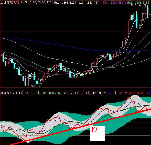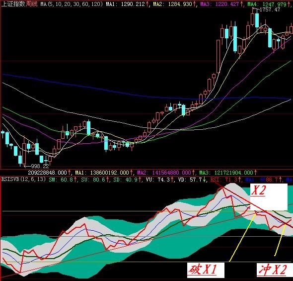 我们用自从998点的趋势可以做X1,在图形的末端我们可以看到1700多点跌破X1,所以我们有了图二