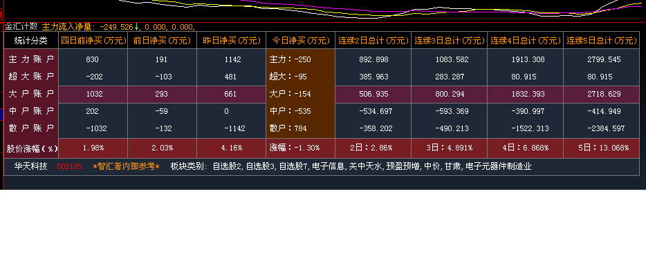 - DRAWTEXTABS(385,85,'大户:' + NUMTOSTRN(REF(VAR6 - VAR11,0)/10000,0)),COLORWHITE;