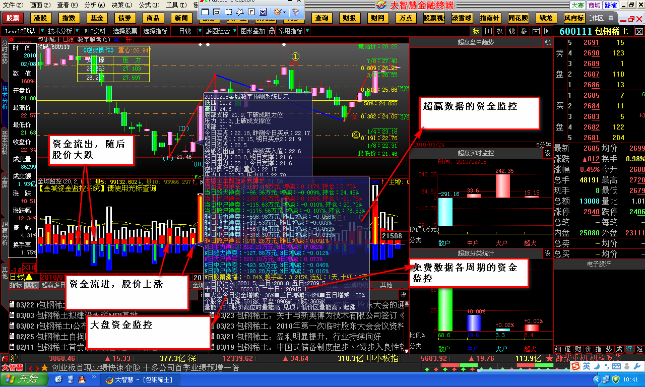 最近把自己看盘分析的一些精品分享给大家了,反响还是很热烈的:)因为工作原因,金城需要离开一段时间,对各位的回帖可能不能及时更新回复,请谅解!最后,把朋友们要的副图指标金城资金监控系统传上来!指标中的超赢数据部分源码是在网上找的,实在搞不清原作者了,本人只是做了一些优化,在此表示真诚的感谢!其他代码是本人综合改写的,是金城VOL的升级版!可以看大盘资金进出(大盘资金计算比较缓慢,需要再优化)个股各周期资金状况(免费数据),超赢资金状况(需要正版数据支持),大盘涨跌数量和个股量能饱和度(最高100,最低0)。主程序推荐用10.20版,否则超赢数据部分不能正常显示!
