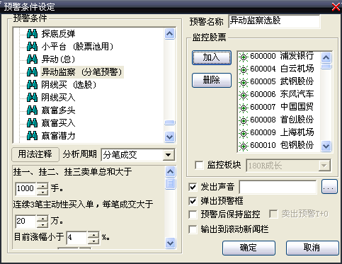 分笔预警指标 阅读 作者:公式网时间 2010-03-26 07:39:35 大智慧公式 月前发过这个指标,当时加密了,不知对大家是否有帮助,我自已就用得不错,可以捕捉到当天拉升前的牛股,现重新优化后供大家使用,不加密不限时,可以直接引入使用,注意分析周期为“分笔成交”,其它参数按自已需要调整。 补充一下:只能盘中预警,盘后选不到股 查看完整内容【开通VIP会员】 VIP会员数十万个公式随便用