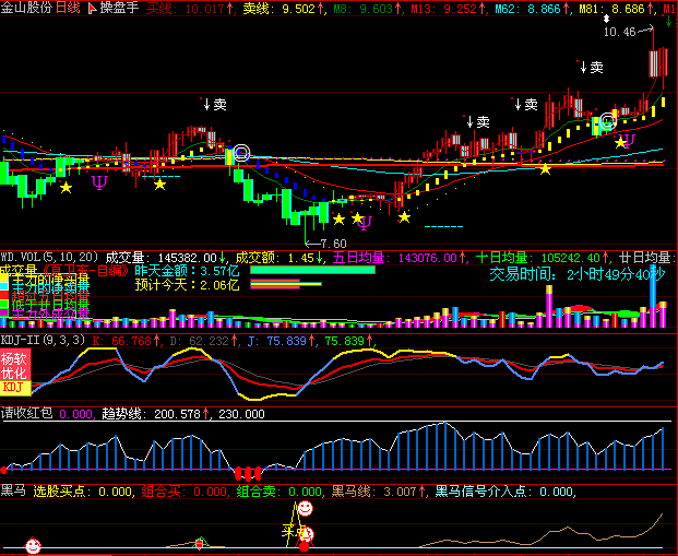 - stickline(cross(买线,卖线) or cross(卖线,买线),open,close,6,0),coloryellow;