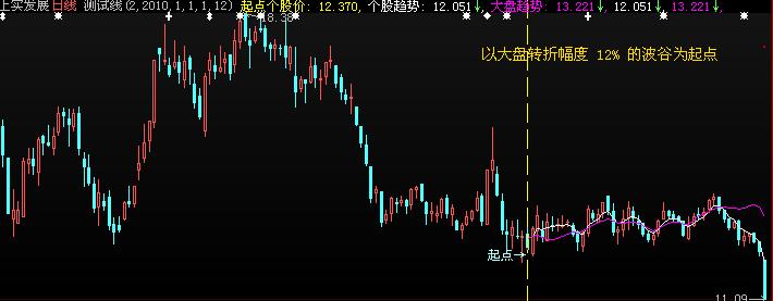 - HHV(C,起点*2),'以大盘转折幅度 '+转折幅+'% 的波谷为起点 ' ),COLOR00DDFF,ALIGN2,LINETHICK2;