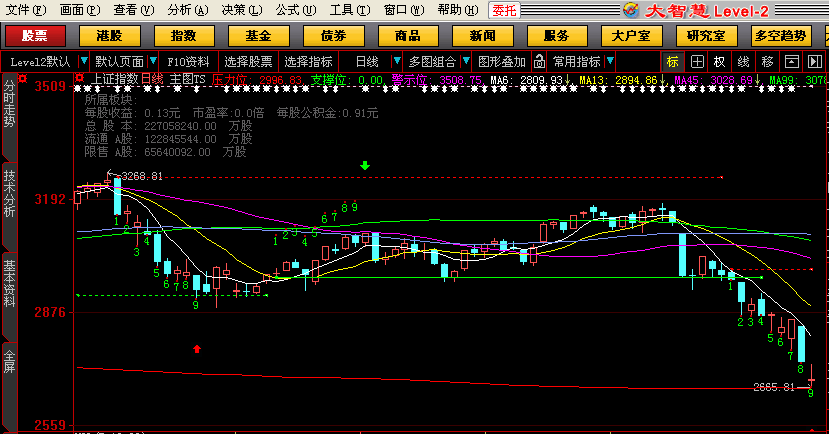 (1)超赢下降趋势线:绿色线形,分为实线和虚线。如下降趋势线被突破,则为实线,行情将会进行反转。