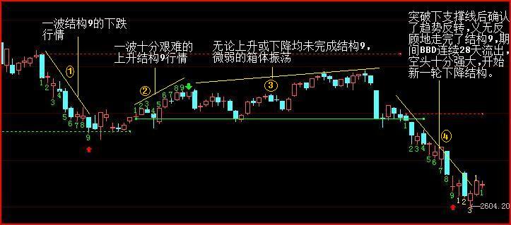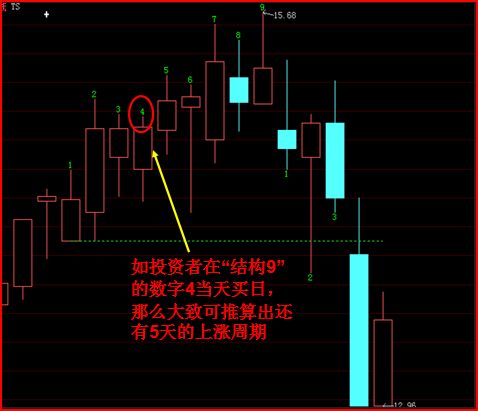 趋势判断:用时间序列9或时间序列13的数字标在K线的上方或下方明确告之是上升趋势或下降趋势,绿色数字属时间序列9,红色数字属时间序列13。