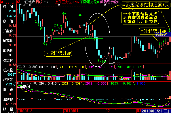 目标位: 用虚线所示的压力位和支撑位,结合数字9或13可大致确定目标位。