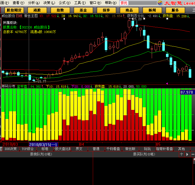 下10为活跃筹码,下20为主力(呵呵,估算啊,别太认真),获利盘上穿50为强势(主力控盘做多,下穿到20以下为超跌)看盘时,通过阶段监测筹码特别是主力筹码和活跃筹码的转换判断主力动向。