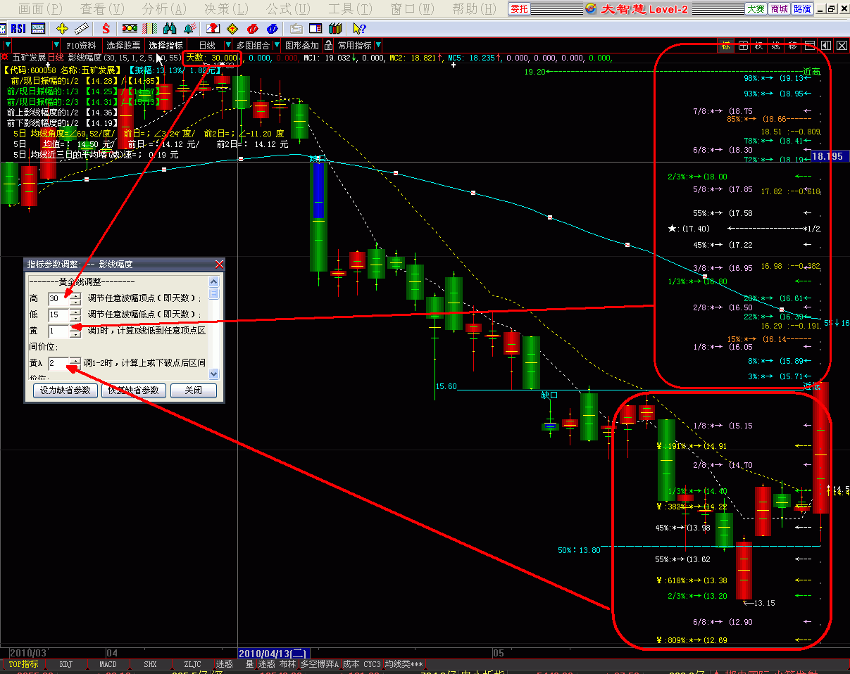 指标参数可根据你自己所需调整。结合K线形态对“黄金分割线”来调整,用顶与底计算回调区间价位及上或下破后的区间价位。看看有关“黄金线买卖法则”,