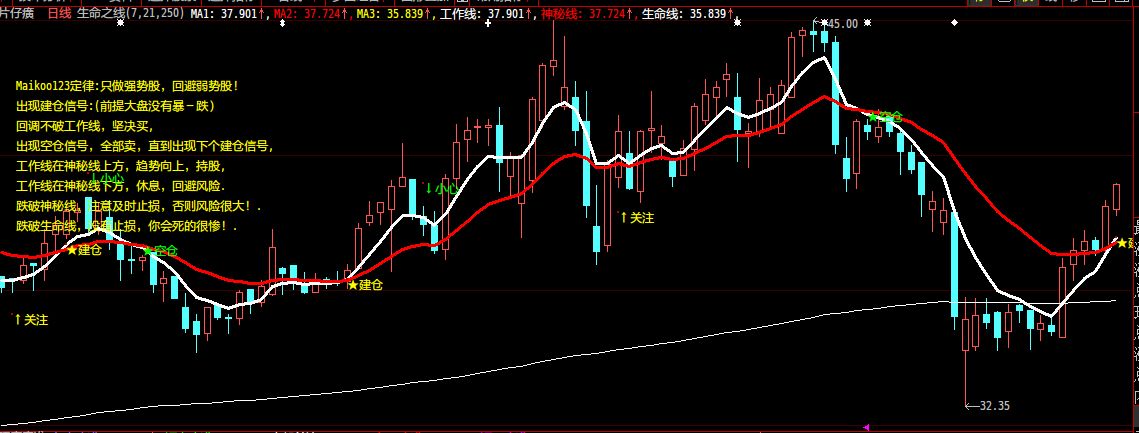 - DRAWTEXTABS(20,200,'跌破生命线,没有止损,你会死的很惨!.'),colorYellow,LINETHICK1;