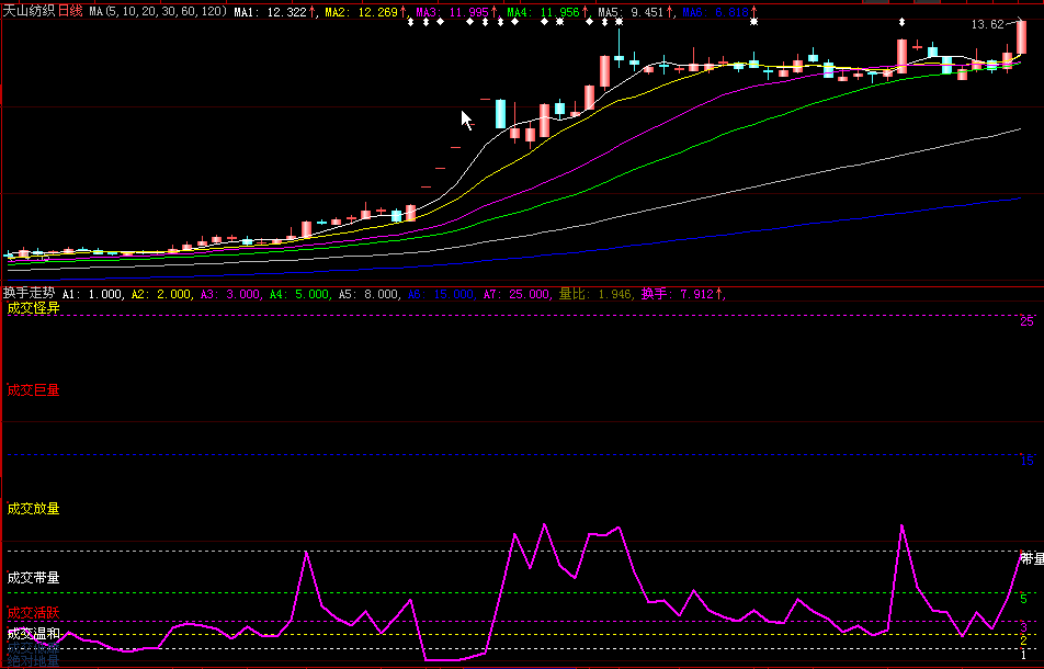 =a6 AND DISPSTATUS=2,换手, '巨量'),COLORRED; - DRAWTEXT(换手<100 AND 换手>=a7 AND DISPSTATUS=2,换手,'怪异'),COLORYELLOW;