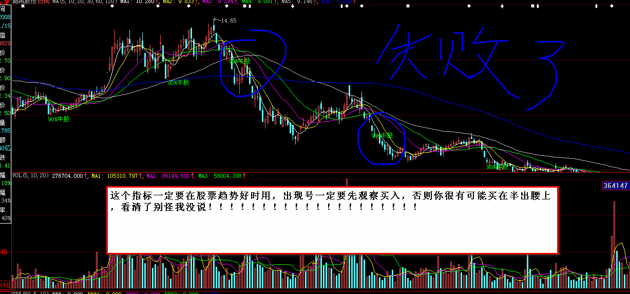 我们炒股为什么,目的只有一个赚钱,指标是为我们炒股服务的,能赚钱的实用指标才是硬道理,指标只是参考作用,赚钱应凭个人的内功起关键作用,我们炒股是我们用指标,而不是指标用你。没有深厚的功底仅凭几个指标在炒股,我看很难说,指标拿到手你应该要看懂这个指标的意思,理解它,不是只看点位准不准,而是要看指标的运行趋势,我认为点位指标我基本不用,而是用趋势指标,庄家可以骗咱散户,唯一骗不了咱小散的是股票的运行趋势,把握好了大方向你就不必担心一时的庄家坑蒙拐骗。