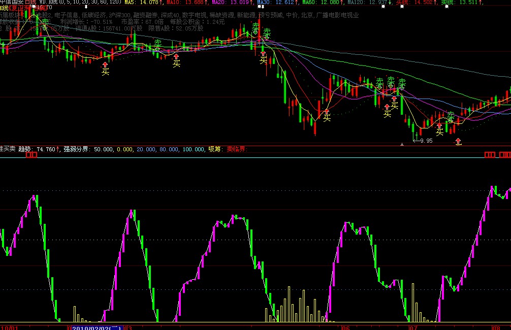 - VAR1:=(HHV(HIGH,9)-CLOSE)/(HHV(HIGH,9)-LLV(LOW,9))*100-70; VAR2:=SMA(VAR1,9,1)+100; VAR3:=(CLOSE-LLV(LOW,9))/(HHV(HIGH,9)-LLV(LOW,9))*100; VAR4:=SMA(VAR3,3,1); VAR5:=SMA(VAR4,3,1)+100; VAR6:=VAR5-VAR2; 趋势: IF(VAR6>45,VAR6-45,0); STICKLINE(REF(趋势,1)< 趋势, 趋势,REF(趋势,1),5,0),colorff00ff; STICKLINE(REF(趋势,1)> 趋势, 趋势,REF(趋势,1),5,0),color00ff00; 强弱分界:50,POINTDOT,Colorffffcc; 0,Color00Ffff; 20,POINTDOT,COlORFFAA66,linethick1; 80,POINTDOT,COlORFFAA66,linethick1; 100,Colorffff33; v1:=llv(low,10); v2:=hhv(h,25); 价位线:=ema((c-v1)/(v2-v1)*4,4); DRAWTEXT(CROSS(价位线,0.3),7,'●'),ColorFFFfff; DRAWTEXT(CROSS(3.5,价位线),102,'●'),ColorFFFfff; Var2q:=REF(LOW,1); Var3q:=SMA(ABS(LOW-Var2q),3,1)/SMA(MAX(LOW-Var2q,0),3,1)*100; Var4q:=EMA(IF(CLOSE*1.3,Var3q*10,Var3q/10),3); Var5q:=LLV(LOW,30); Var6q:=HHV(Var4q,30); Var7q:=IF(MA(CLOSE,58),1,0); Var8q:=EMA(IF(LOW<=Var5q,(Var4q+Var6q*2)/2,0),3)/618*Var7