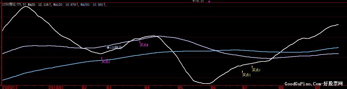 DRAWTEXT(ma120>=ref(ma120,1) and cross(c,ma20) and cross(c,ma120) and v>ref(v,1),l-0.13,'买点2'),colorff00ff;
