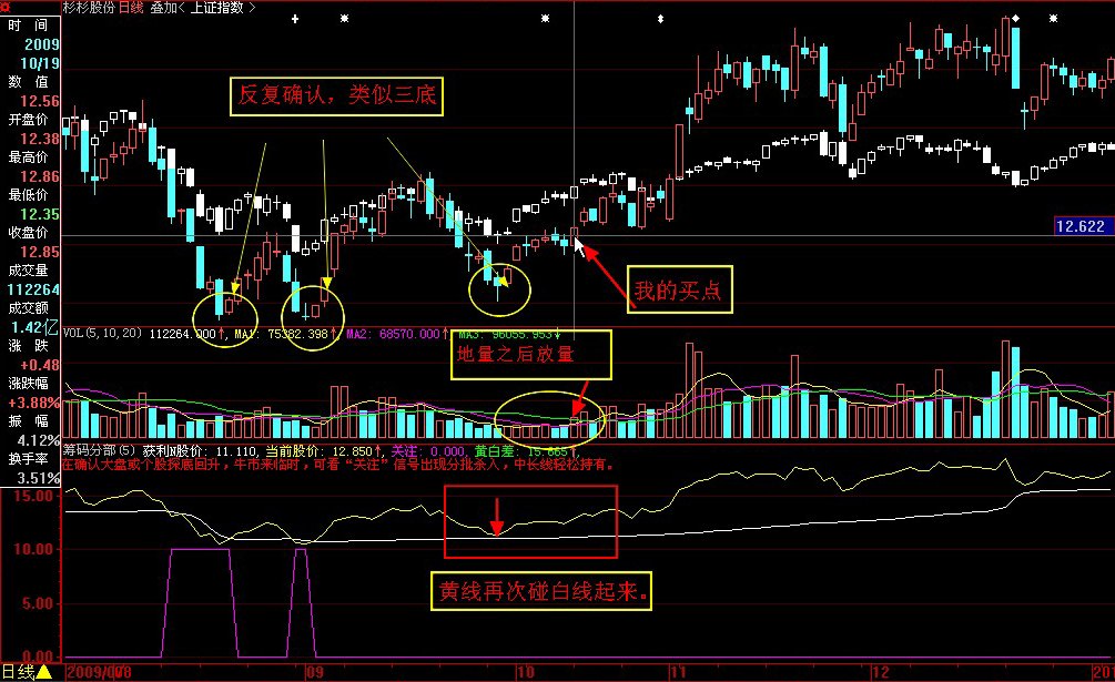 说明:在确认大盘或个股探底回升,牛市来临时,以“关注=10”选股,如果“关注"信号连续出现,也许还要等待,说明还没跌透还在连续下跌。一旦企稳在参考股价和成交量的情况下,分批进入,长期持有。当然也可以波段操作,每次黄线(股价)接近白线(COS