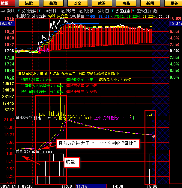 本次5分钟量比与上一个5分钟量比,平均值进行比较,是发现成交量异动的好指标。