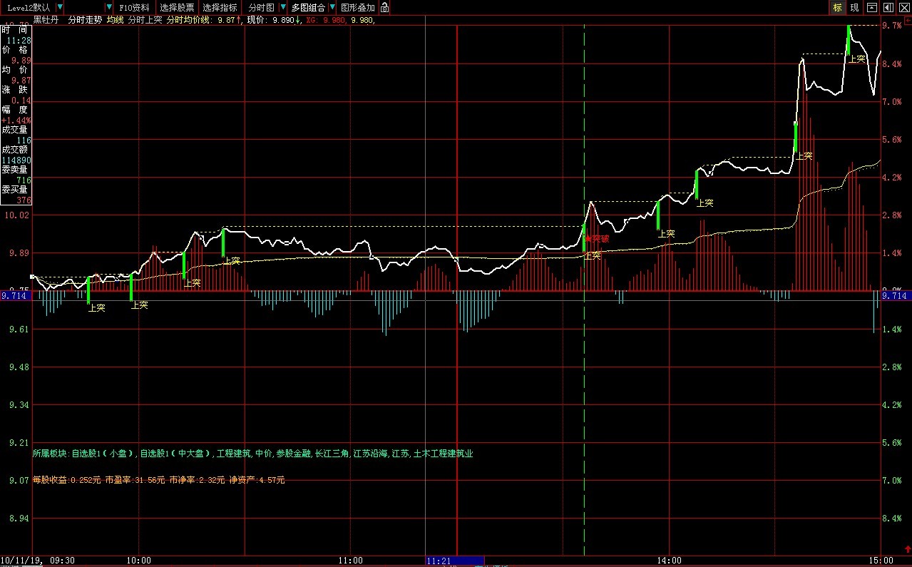 分时突破指标,我是个新手,只懂得用别人的指标,自己很少动脑子去想怎么改指标。我知道每个人的指标只有自己可以用的来,我最近把这个分时突破指标改了一下不是很好看,指标还没经过验证但相信有上突的信号和突破的信号出来,在这里讲讲我自己对这个指标的使用想法:第一个条件在分时图中股价不得超过3%,第二个条件时间不超过下午两点也就是分钟数不超过180分钟(虽然后面的时间里也会有其它个股会突破但涨幅有限不能达到我的目的,当然也不排除主力高控盘的个股),要知道会上突和突破的个股多的去了,会上突和突破但也要有利润才行没利润的话也是白忙活。