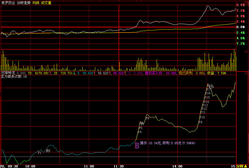大家可以根据不同的行情不同的喜好自已修改。使用经验:在开盘后30分钟内如果出现这个B点,收益和成功率都相对高一些。我们可以这样设想,开盘后30分钟内某股就有1千万大单资金流入而且盘子不大,这一定是有原因的,不是拉高出货就是有什么利好