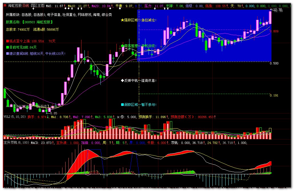 3、一品选择:高高在上,无阻飞扬,是一品最喜欢选择的目标!因此,这样的目标往往处于主图画面的右上角----无论是短线或是中线,都是这样!因此,一品特意将【四区主图】的右上角强势拉升区域配上深蓝背景色,以示强调与突出!这,便是一品的最爱!