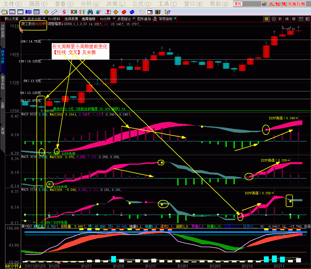 对【MACD】了解的朋友都知道它是体现趋势经典指标。在实际应用中不同人,都有不同的见解,基本是以【以0轴上下的DIFF背离 MACD柱线的长短 DIFF与DAE的交叉 周期共振点】结合主图里的K线的组合形态以及均线系统及所掌握各种理论来实现自己的预期操作模式。利用【MACD】的跨周期5分 15分 30分 60分,在同一图表看盘使你更好的清楚你自己想做什麽。因你可看到“大周期中小周期”的演绎过程,达到可看长做短效果。在使用过程自己也可对自己熟悉了解的理论【均线 波浪 形态 切线 ......等】相互印证来做预期操作!说明一下因“软件”的关系【通达信】只能在静态下看, “大智慧 飞狐”可在动态下看。如图