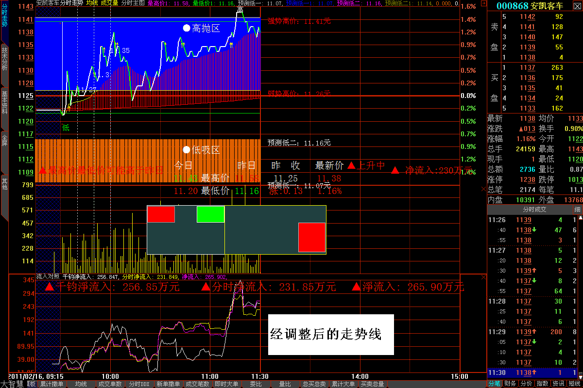 方法:在“分时走势”点“画面”,点“分析周期“再点”分笔成交“,OK,这时候三条走势线比较接近”分时主图“的走势线的,值就比较准确。