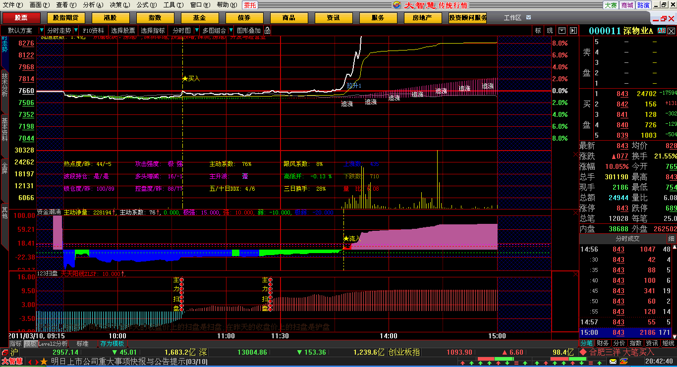 - DRAWTEXTREL(0,850,'信号出现时股价同时运行在昨天的收盘价上的扫盘是扫盘;在昨天的收盘价上的扫盘是护盘 '),LINETHICK2,COLOR112241;