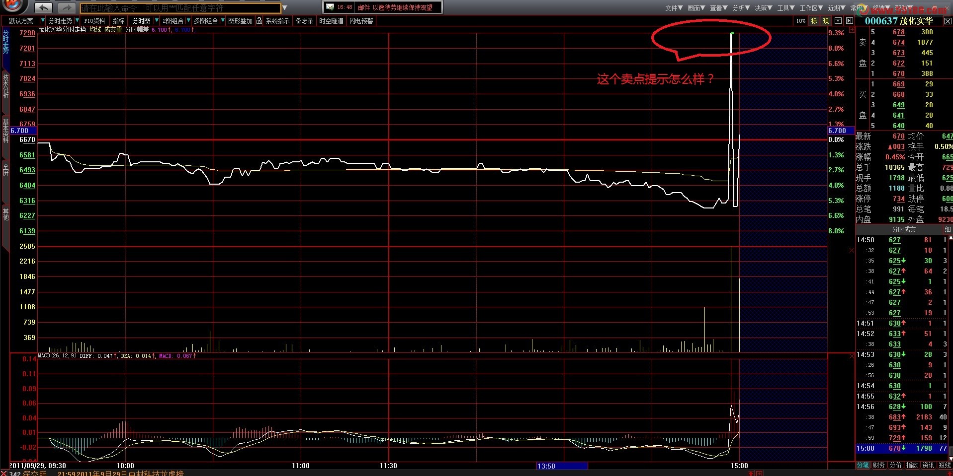 分时幅差在+4.5以上的时候 分时白线会变绿色 此刻量还能不能有效放大 找个高点卖掉吧 日k线先不说了 分时图股价很快就会回落的