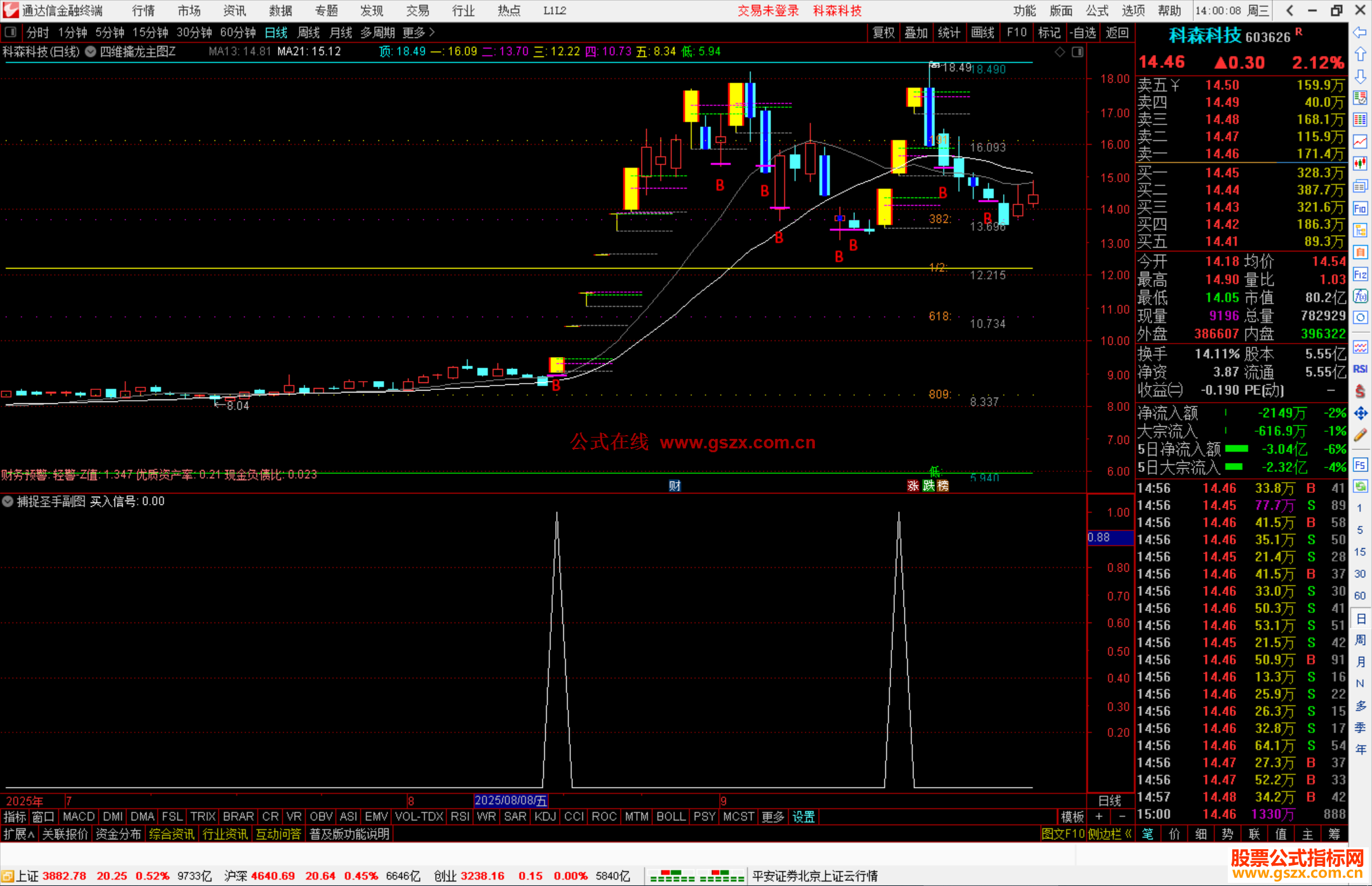 趋势线:=SMA(MAX(CLOSE-LC,0),14,1)/SMA(ABS(CLOSE-LC),14,1)*100;