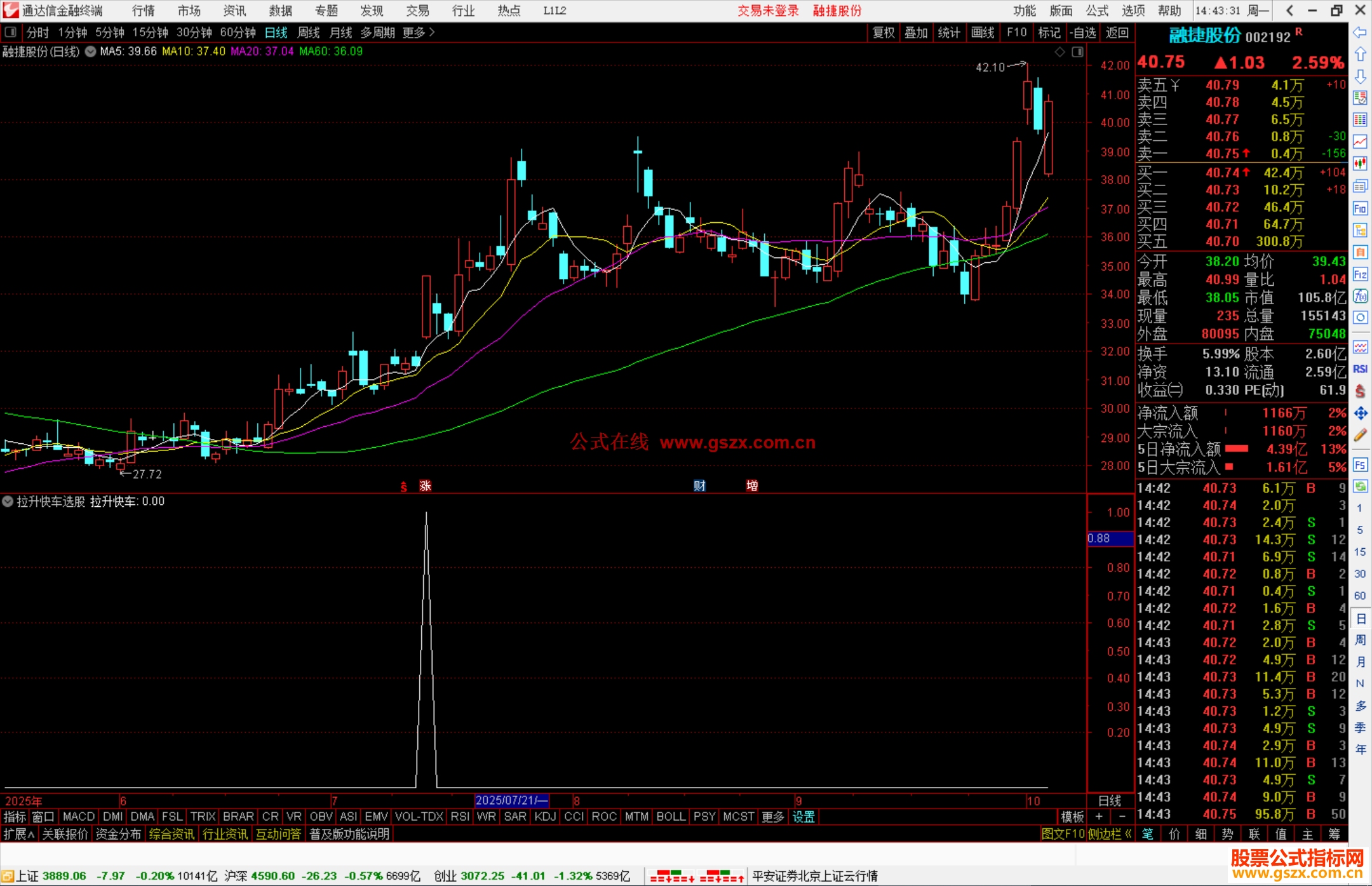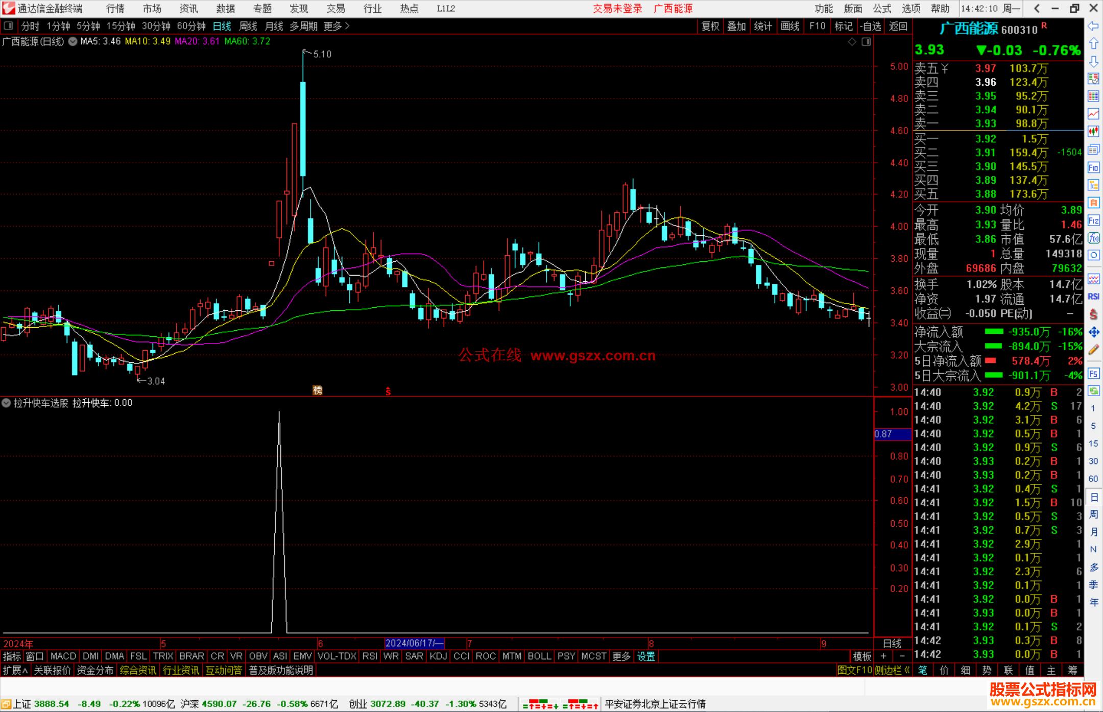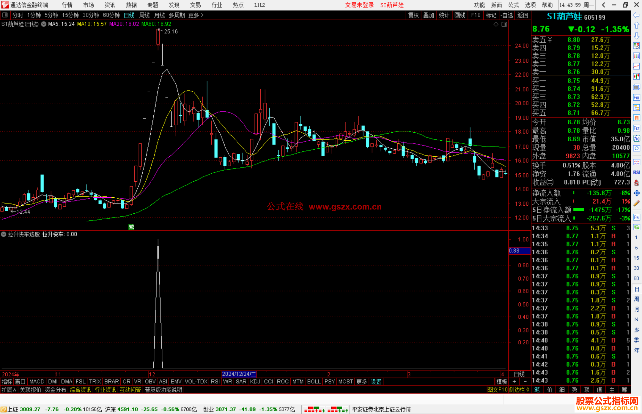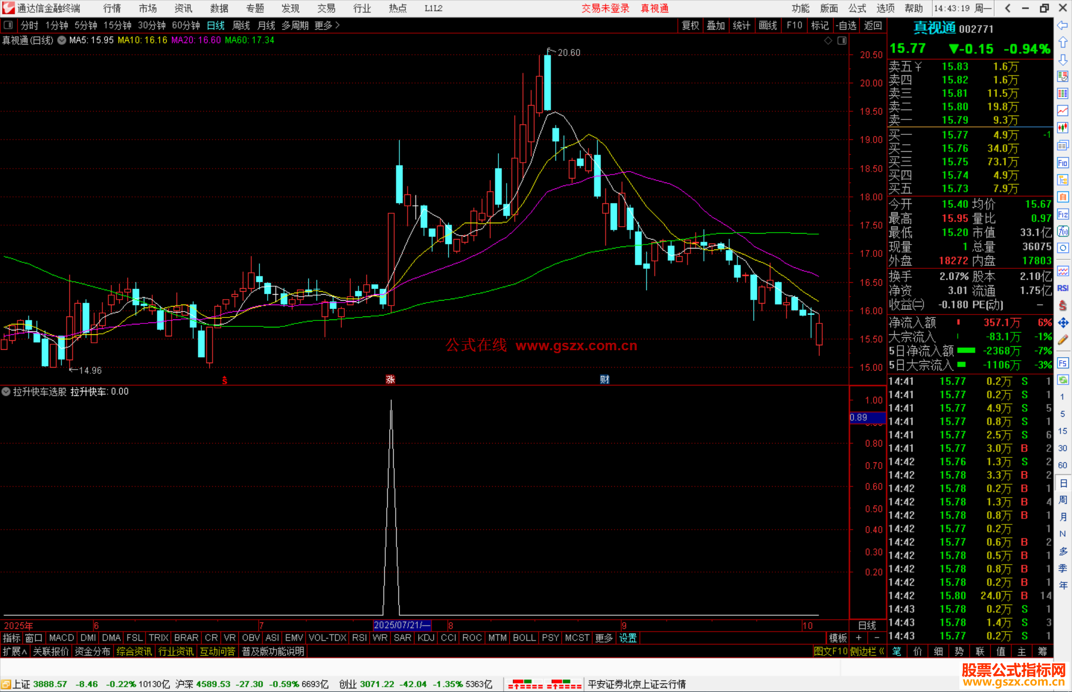 通达信拉升快车选股指标公式副图源码 阅读 作者:公式网时间 2025-10-13 14:44:38 通达信公式 XG1:=(3*C+O+H+LOW)/6;XG2:=0.01*EMA(AMOUNT,13)/EMA(VOL,13);XG3:=COST(85);XG4:=COST(15);XG5:=XG3-XG4;XG6:=(XG3+XG4)/2;XG7:=XG5/XG6*100< 30;XG8:=HHV(HIGH,250);XG9:=LLV(LOW,250);XG10:=XG8-XG9;XG11:=(XG6-XG9);XG12:=XG6< (XG10*0.4+XG9);XG13:=XG7 AND XG12;XG14:=C/REF(C,1)>1.04;XG15:=EMA(100*(C-LLV(LOW,30))/(HHV(H,30)-LLV(LOW,30)),3);XG16:=XG1 查看完整内容【开通VIP会员】 VIP会员数十万个公式随便用