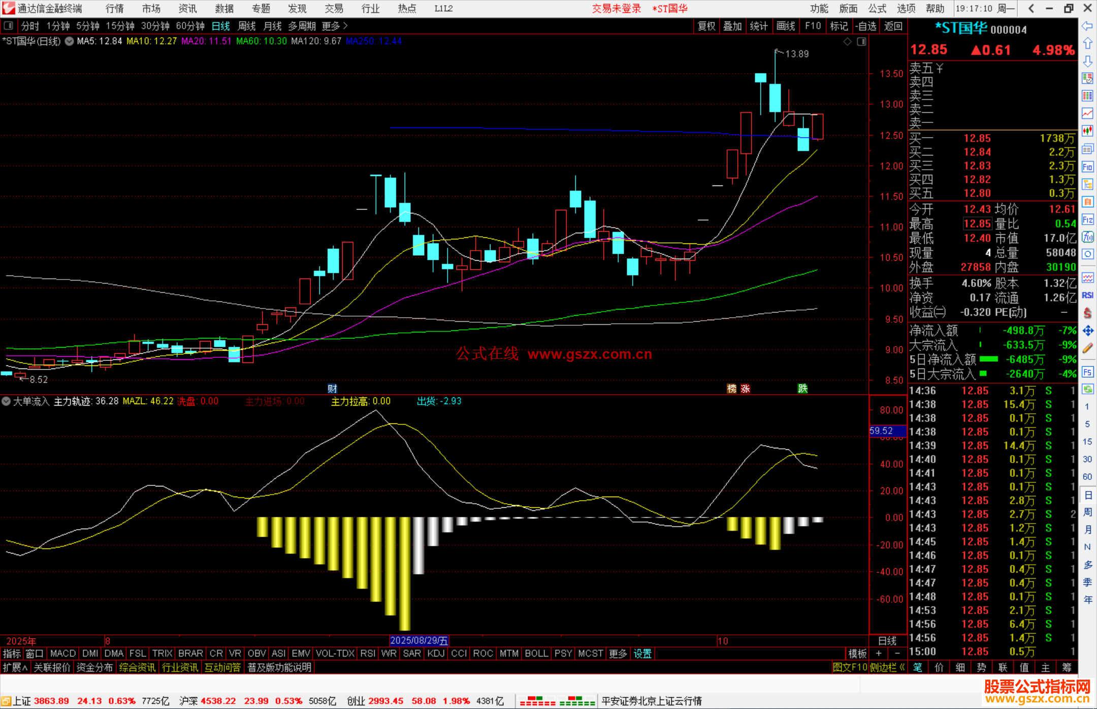 主力轨迹:100*EMA(EMA(MTM,N1),N1)/EMA(EMA(ABS(MTM),N1),N1),COLORWHITE;