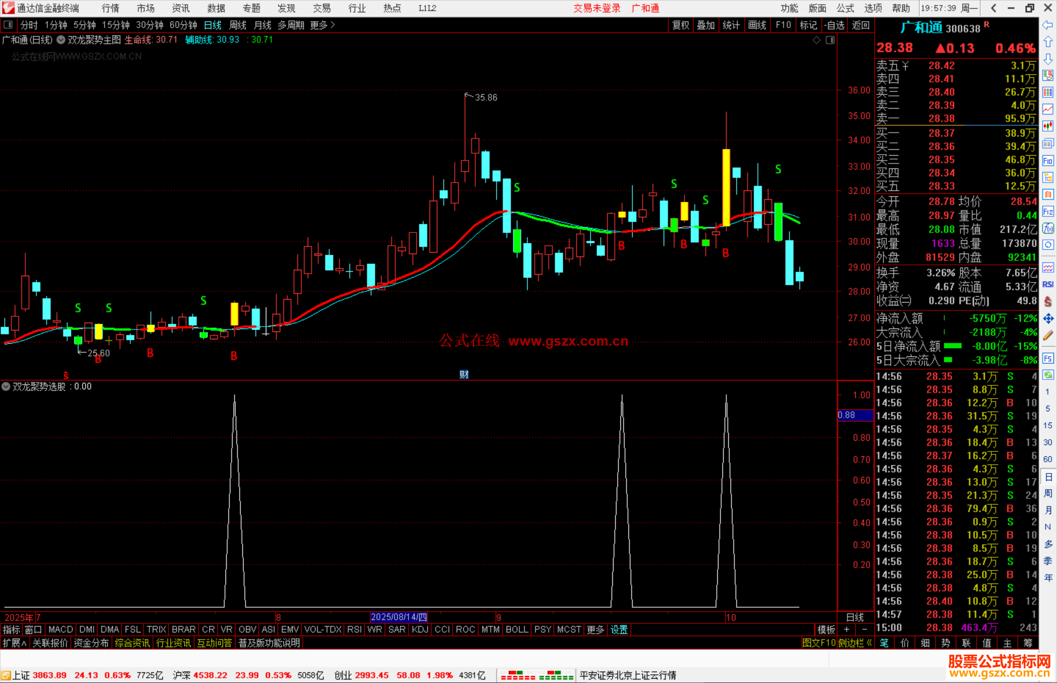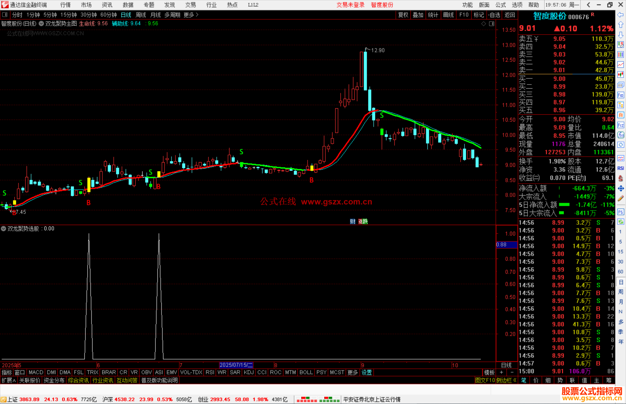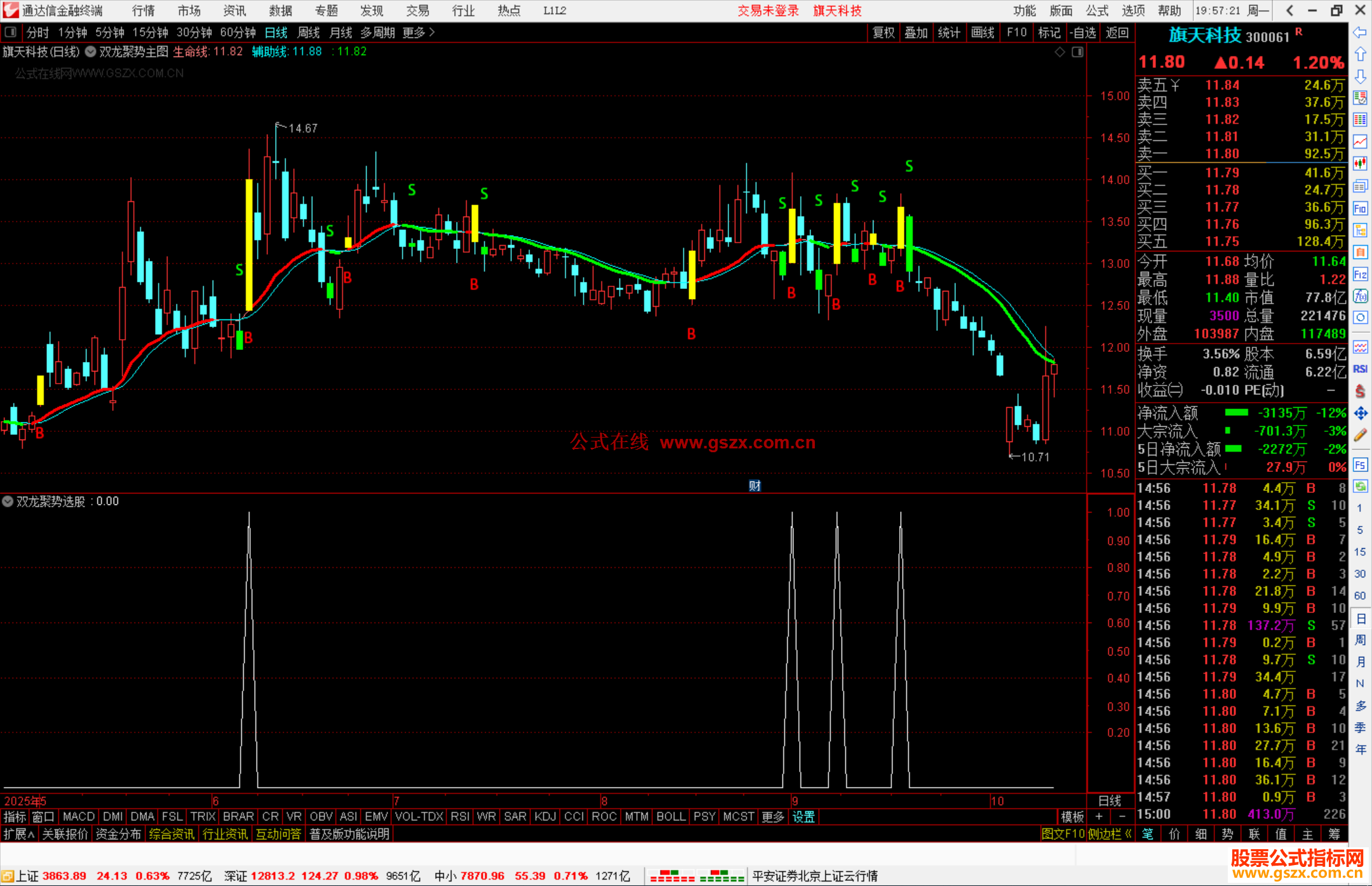 生命线:=(20*牛股小帮手+19*REF(牛股小帮手,1)+18*REF(牛股小帮手,2)+17*REF(牛股小帮手,3)+