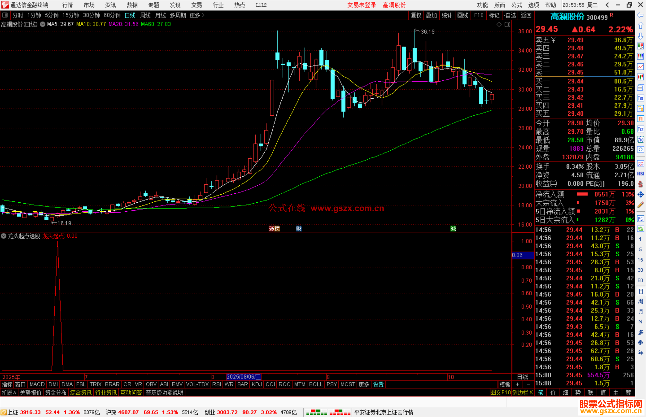 G1:=CLOSE;G2:=LOW;G3:=OPEN;G4:=HIGH; VARB1:=DYNAINFO(7)>G3; VARB2:=VARB1 AND DYNAINFO(7)>EMA(G1,8) AND DYNAINFO(7)>EMA(G1,21) AND DYNAINFO(7)>EMA(G1,60); VARB3:=VARB2 AND G3< EMA(G1,21) AND G3< EMA(G1,60); VARB4:=VARB3 AND (DYNAINFO(7)-G3)>0.0618*DYNAINFO(7); VARB5:=REF(VARB4,2) OR REF(VARB4,1); VARB6:=MA((VOL-R