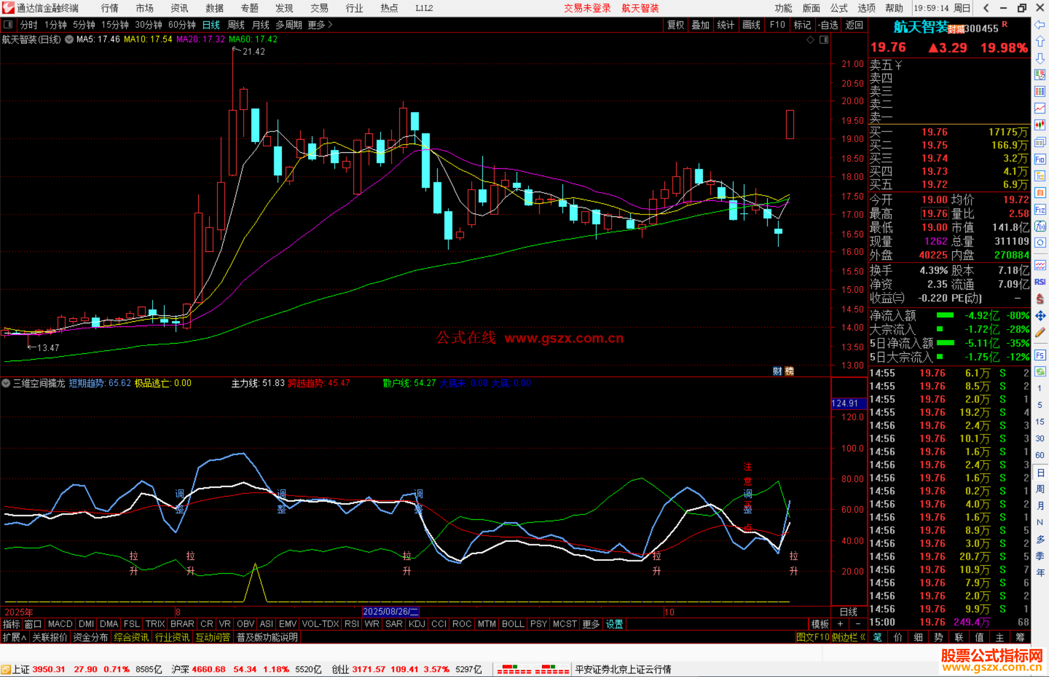 DRAWTEXT(C-O>=0 AND O/L>1.05 AND L<=LLV(L,20),短期趋势,'★'),COLOR9933FF, LINETHICK1;