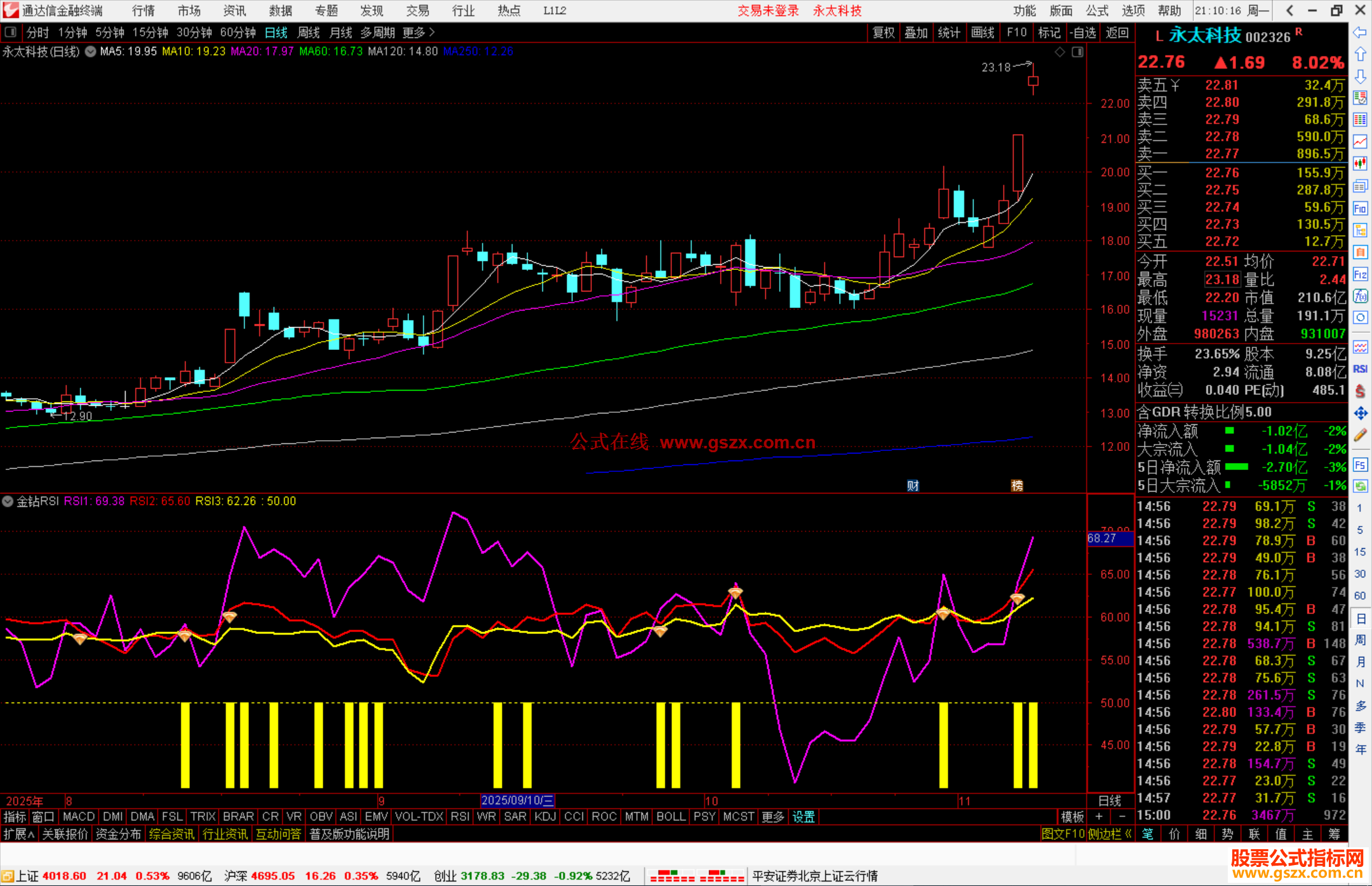 RSI1:SUM(MAX(CLOSE-VAR1,0),22)/SUM(ABS(CLOSE-VAR1),22)*100,COLORMAGENTA,LINETHICK2;