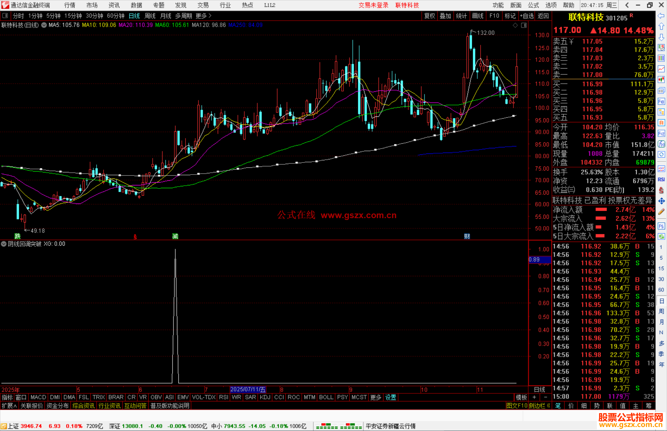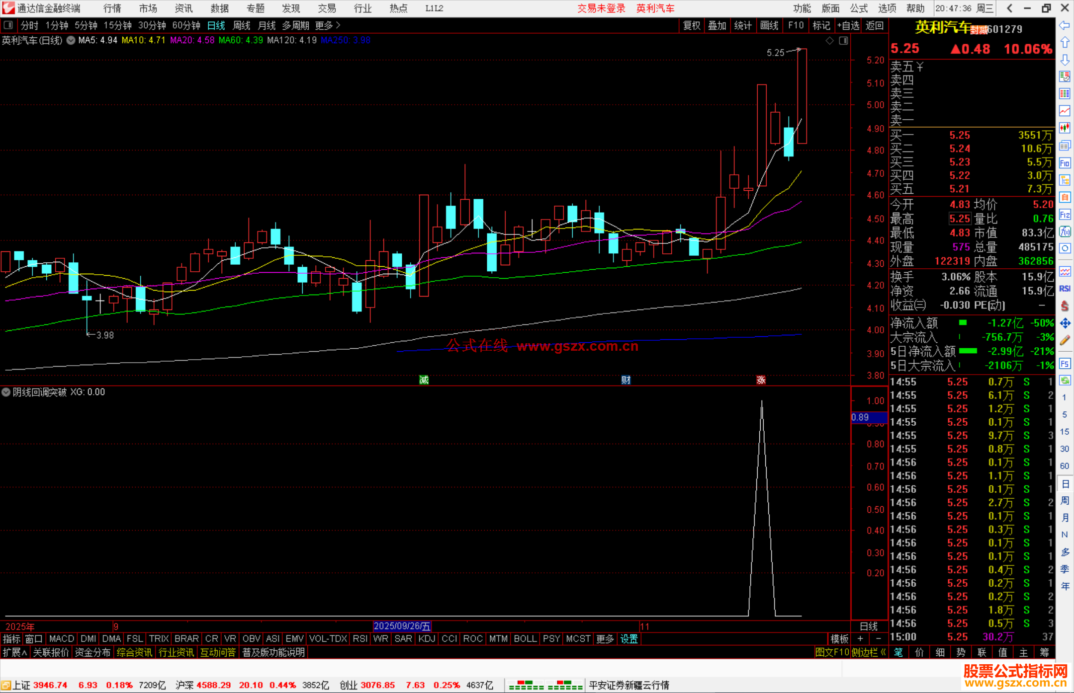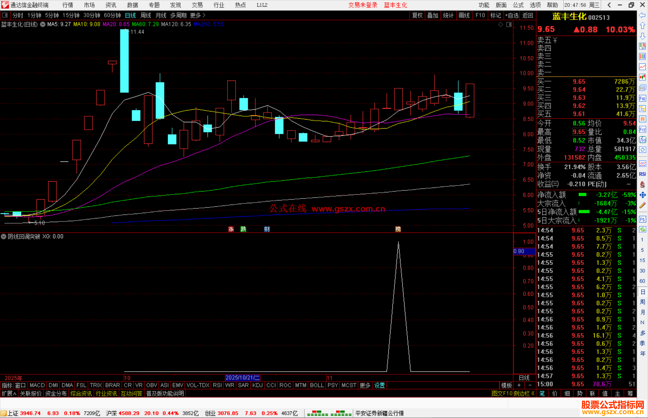 VAR1:=BARSLAST(CLOSE>REF(CLOSE,1)*1.095 AND CLOSE=HIGH); VAR2:=(CLOSE-REF(CLOSE,VAR1+1))/REF(CLOSE,VAR1+1)*100; VAR3:=EVERY(CLOSE< OPEN,VAR1); VAR4:=COUNT(REF(CLOSE,1)/CLOSE>1.09,VAR1)>0 AND REF(CLOSE,1)/CLOSE>1.09; VAR5:=VAR2>-1 AND VAR3 AND VAR4; VAR6:=B