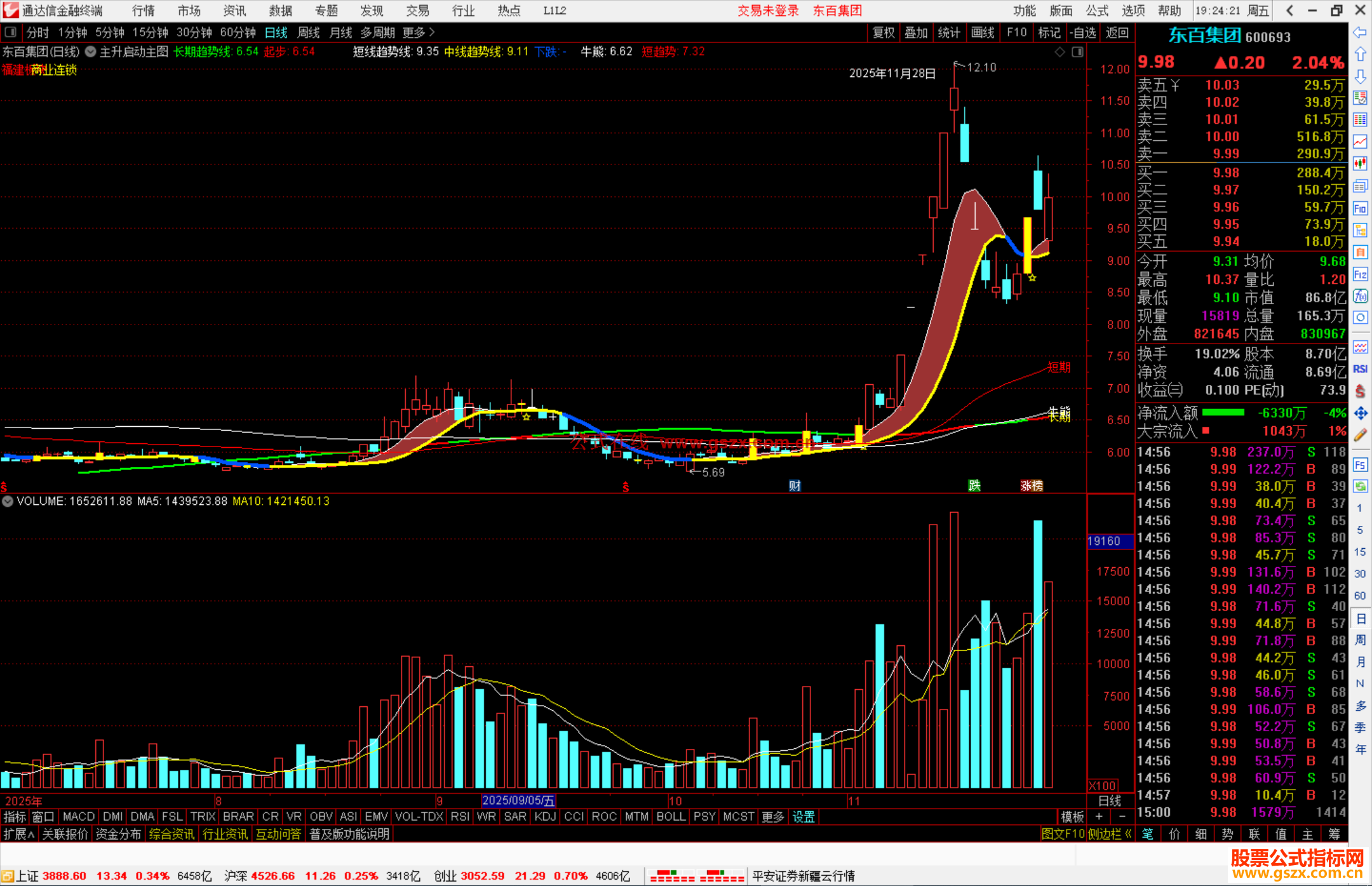 长期趋势线:(MA(C,188)),COLORGREEN,LINETHICK2;