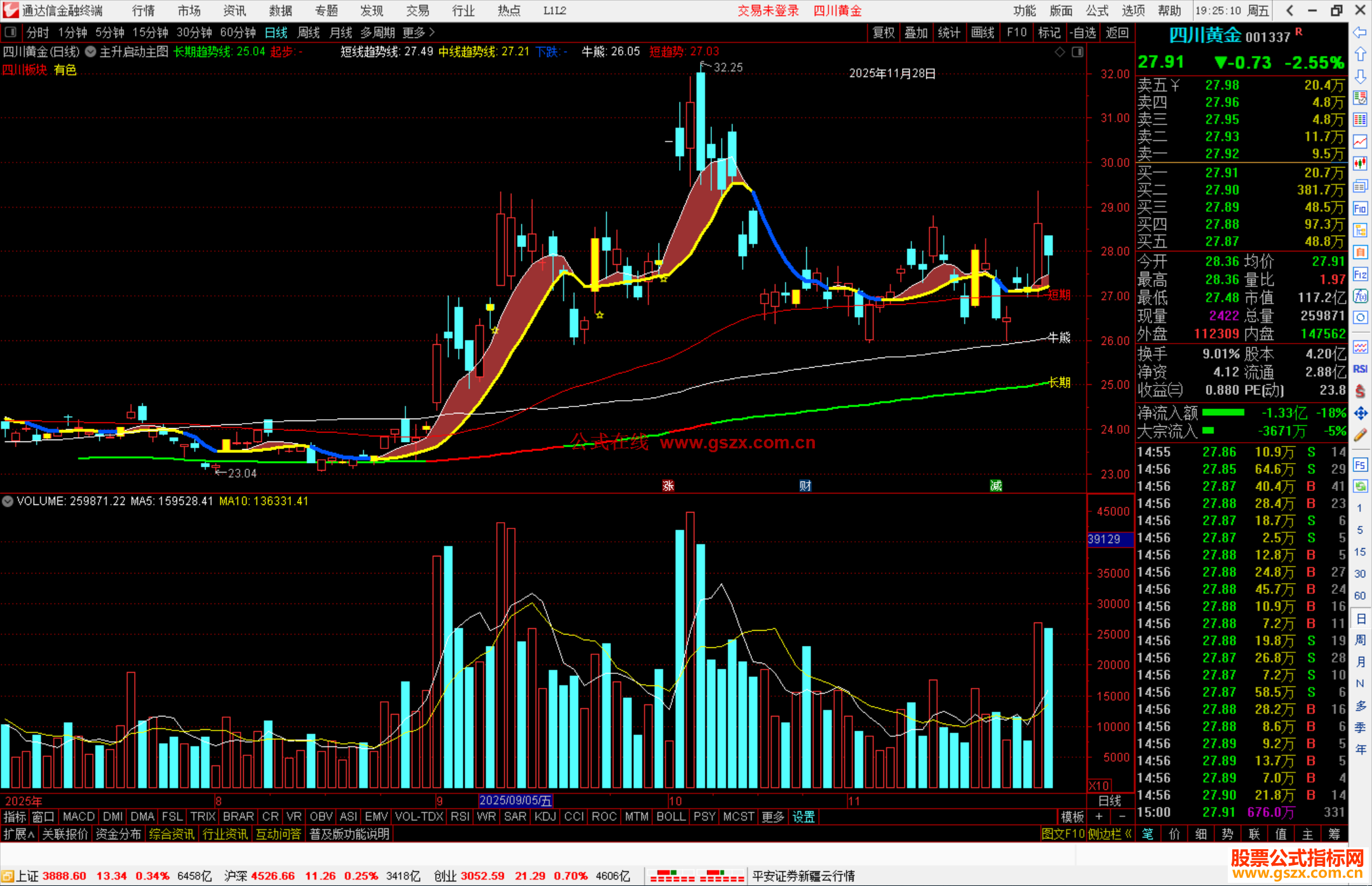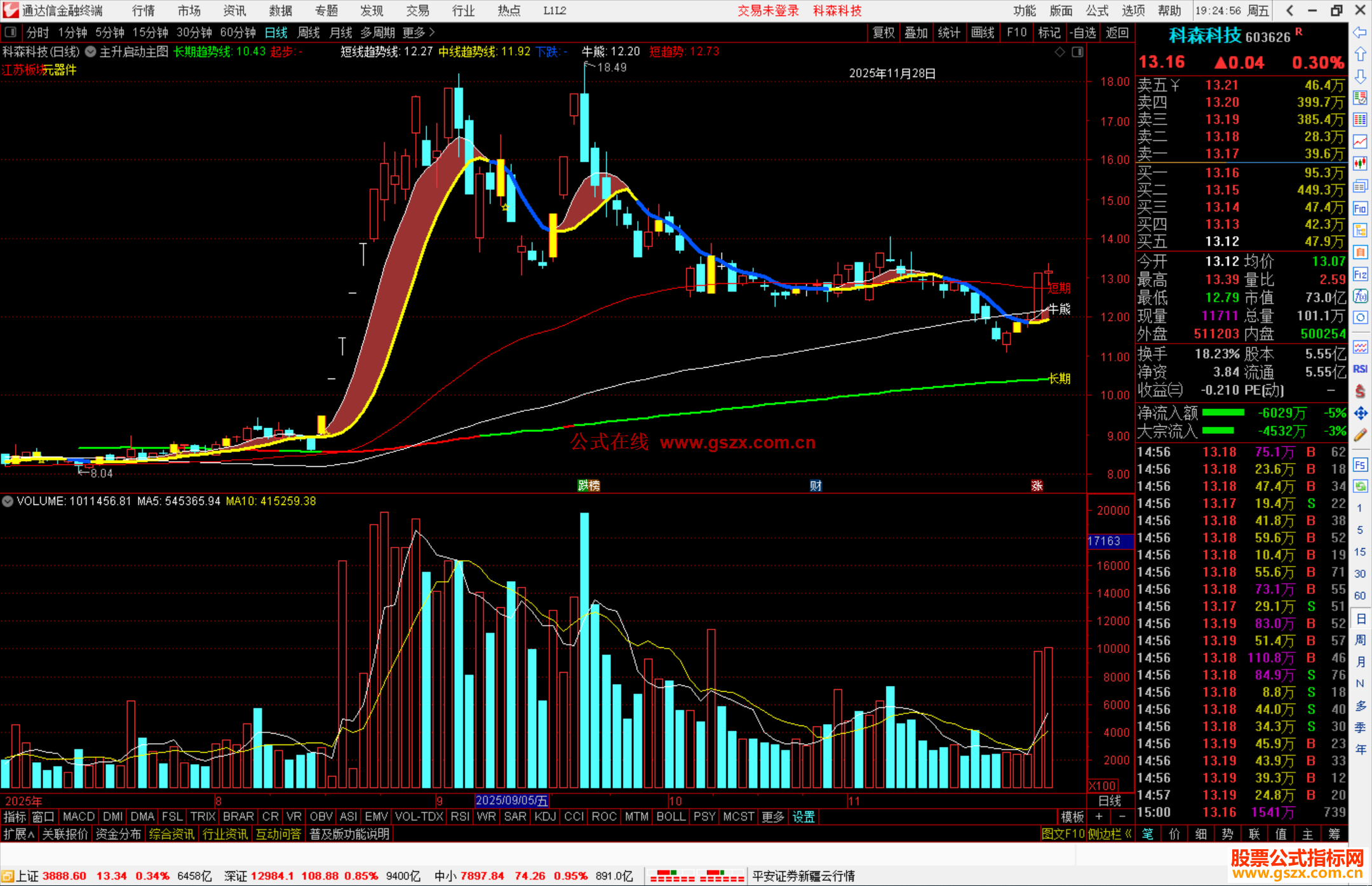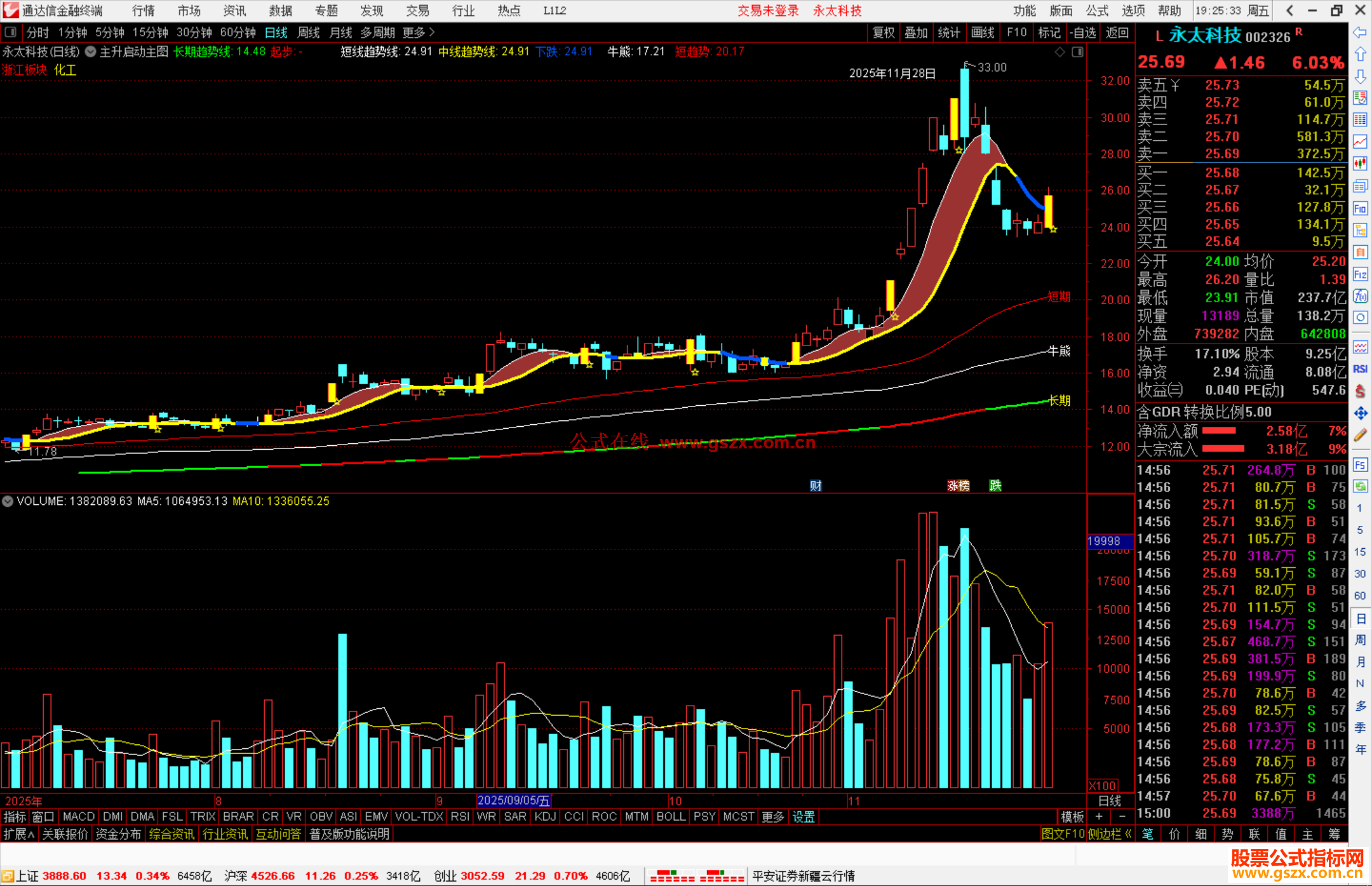 DRAWTEXT(ISLASTBAR,长期趋势线,'长期')COLORYELLOW;
