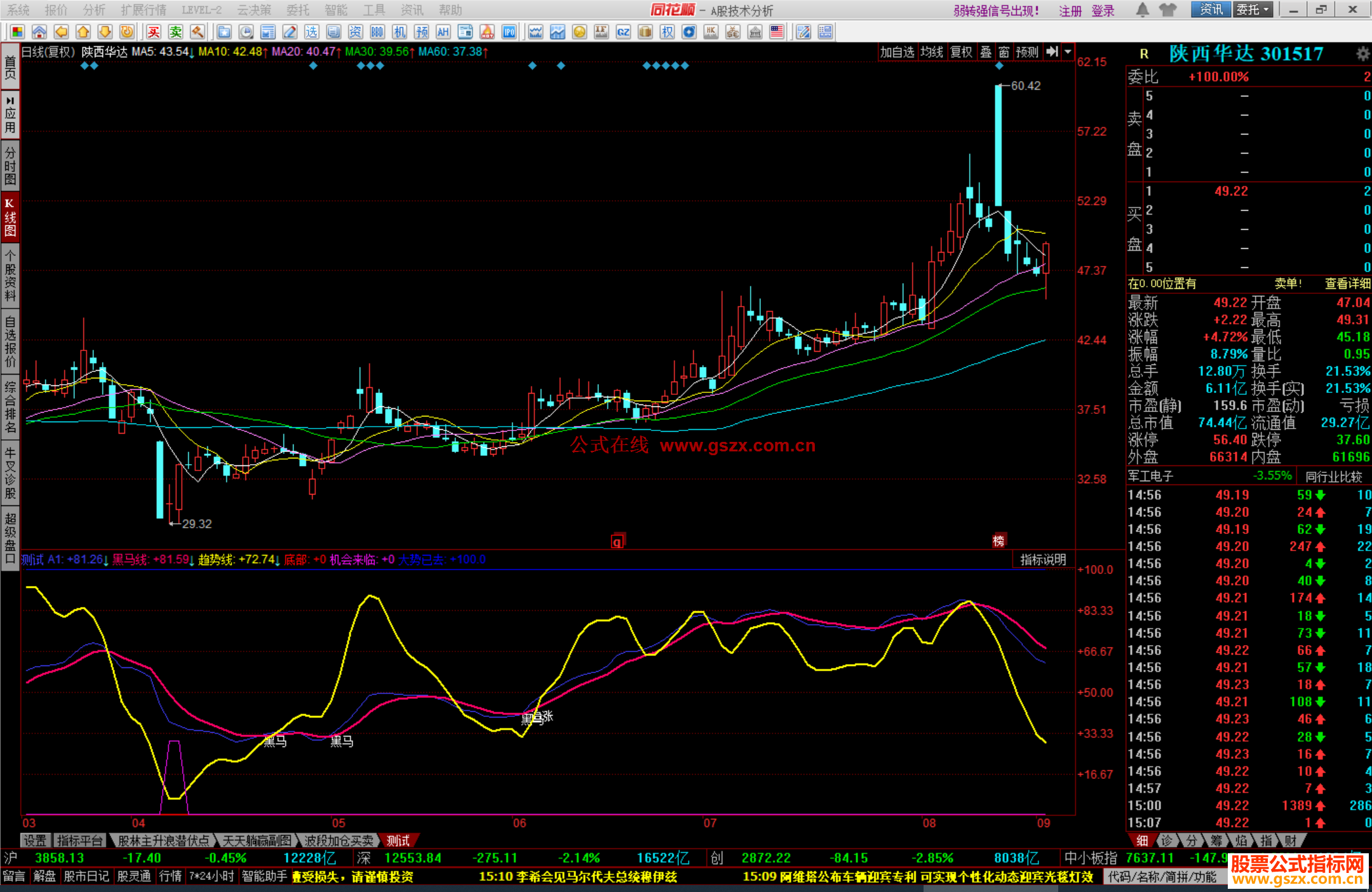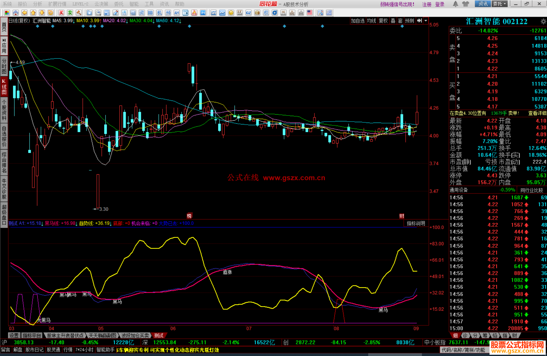 黑马线:EMA(A1,5),LINETHICK2,COLOR6600FF;