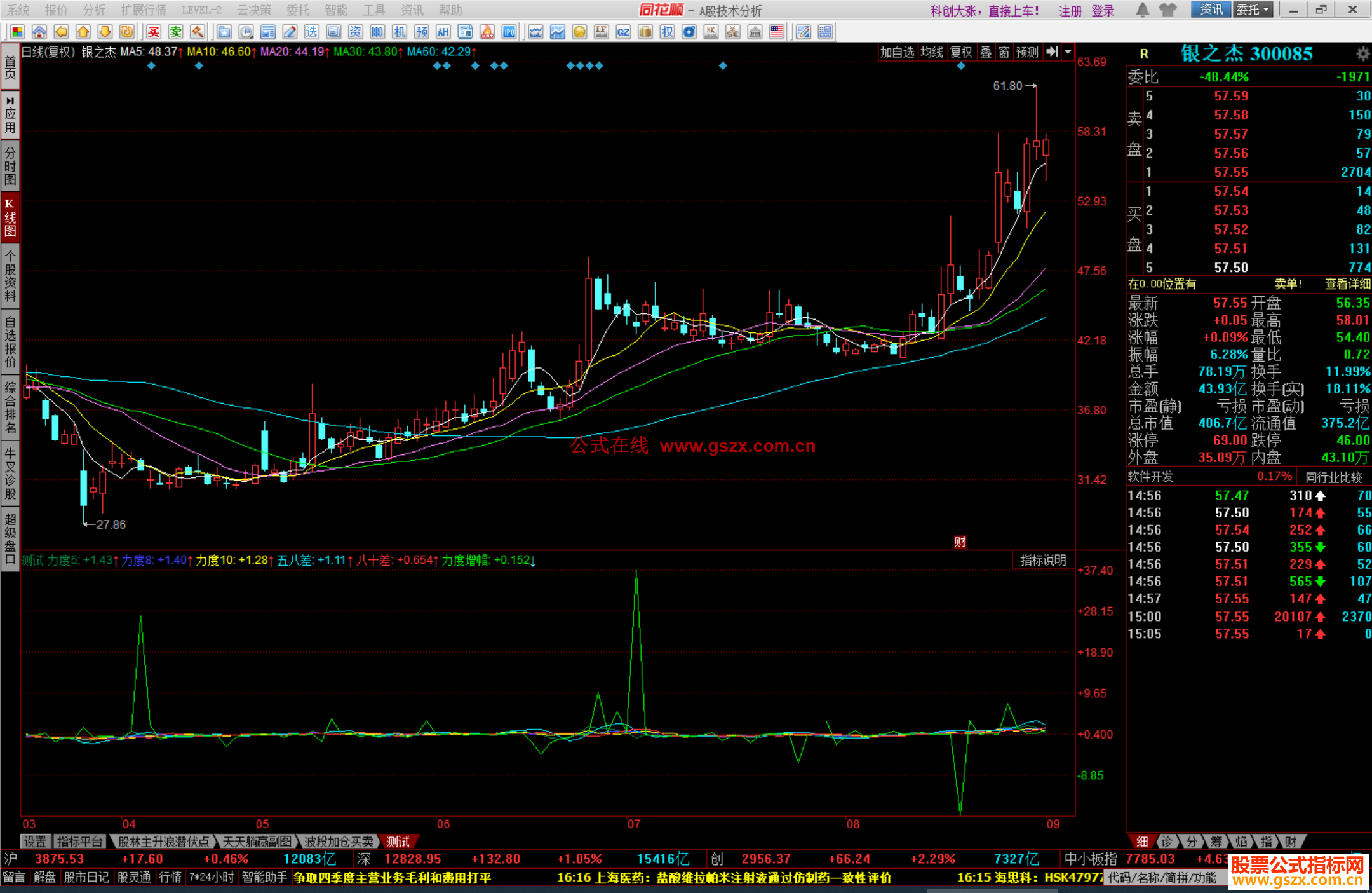 同花顺均线上涨力量公式测试副图源码 阅读 作者:公式网时间 2019-10-19 09:41:36 同花顺公式 同花顺均线上涨力量公式 均价5:=MA(CLOSE,5); 均价10:=MA(CLOSE,10); 均价8:=MA(CLOSE,8); 力度5:均价5-REF(均价5,1); 力度8:均价8-REF(均价8,1); 力度10:均价10-REF(均价10,1); 五八差:均价5-均价8; 八十差:均价8-均价10; 力度增幅:力度5/(HIGH-REF(C,1)); 查看完整内容【开通VIP会员】 VIP会员数十万个公式随便用