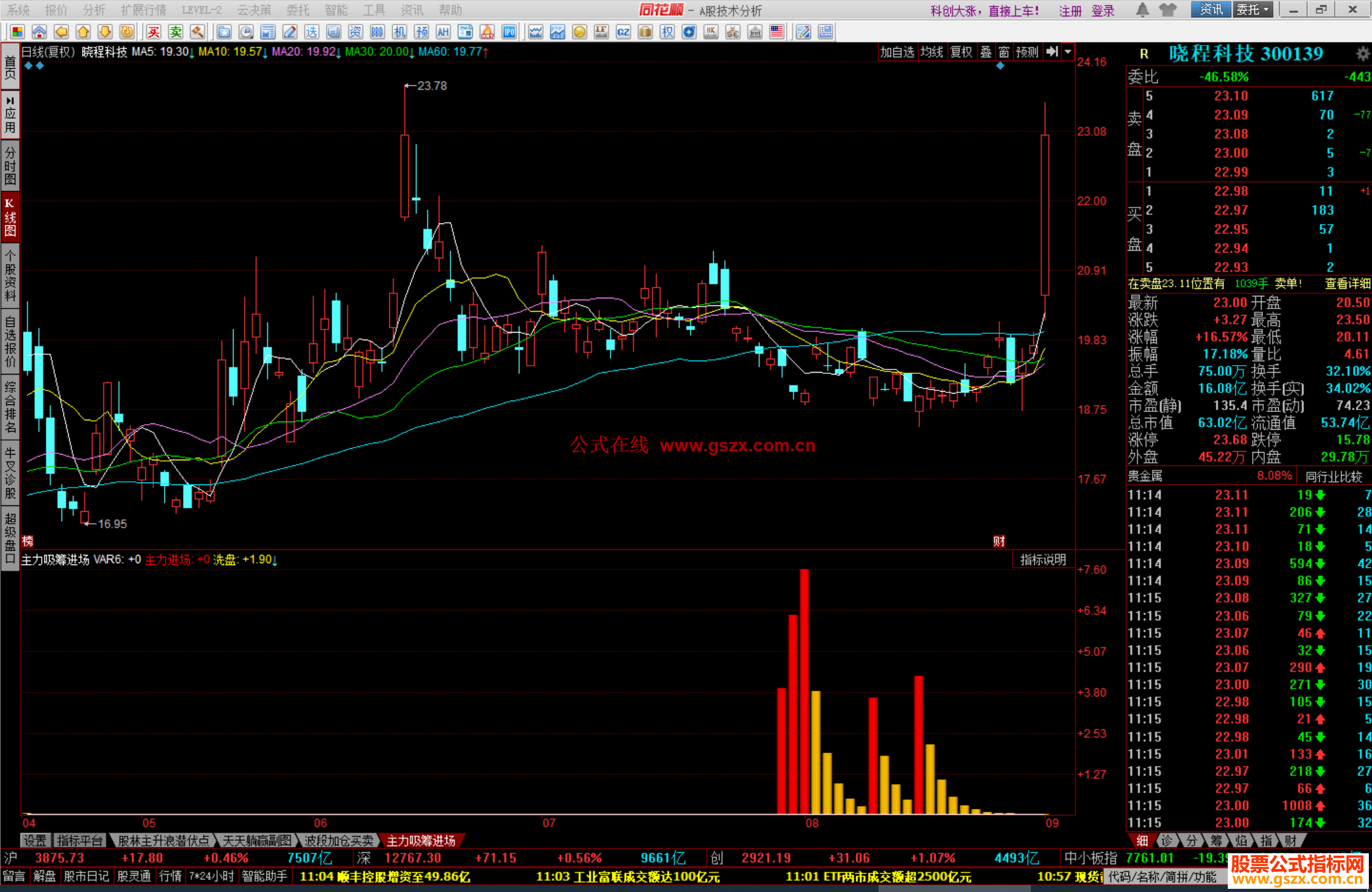 主力进场:IF(VAR5>REF(VAR5,1),VAR5,0),colorred,NODRAW;