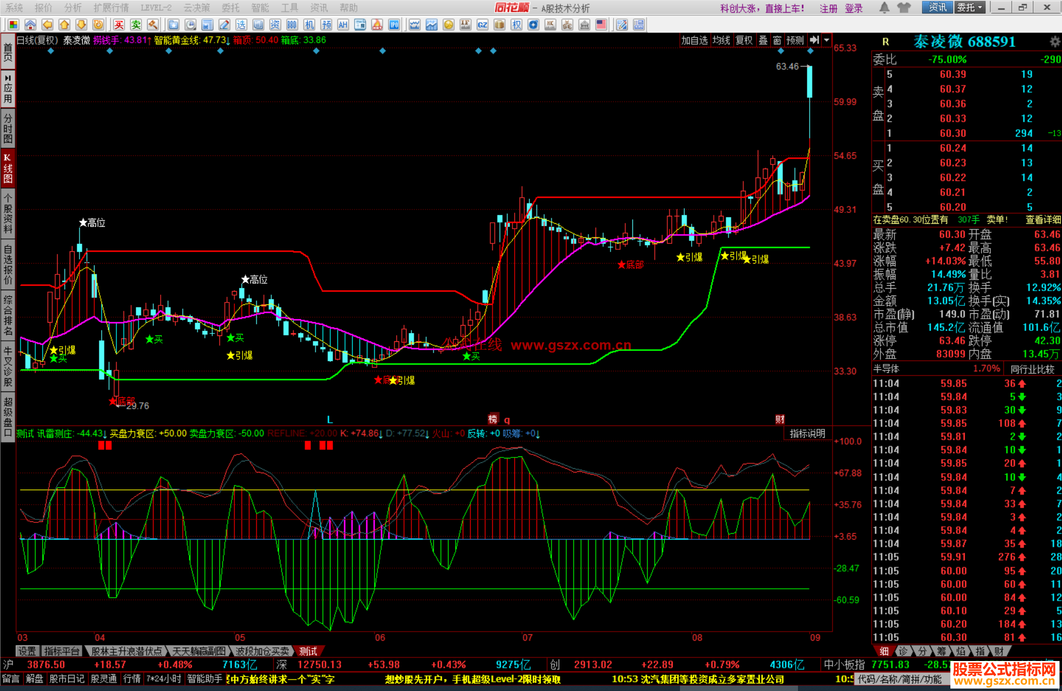 上高:=H;上低:=L;JJ:=(上开+上高+上低)/3;A:=EMA(JJ,4);智能黄金线:A,coloryellow,LINETHICK1;