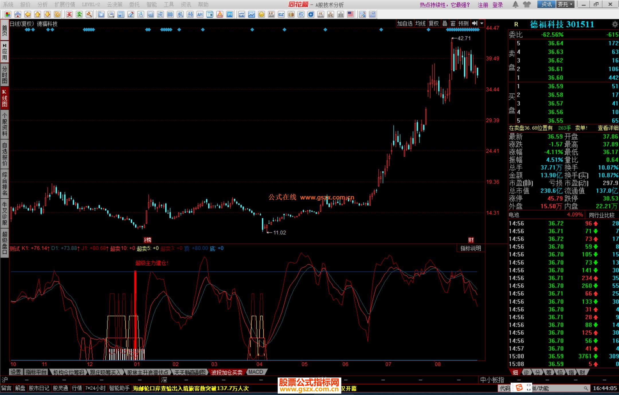 买:=IF( 底部>REF(底部,1),40,0),colorred,LINETHICK4;